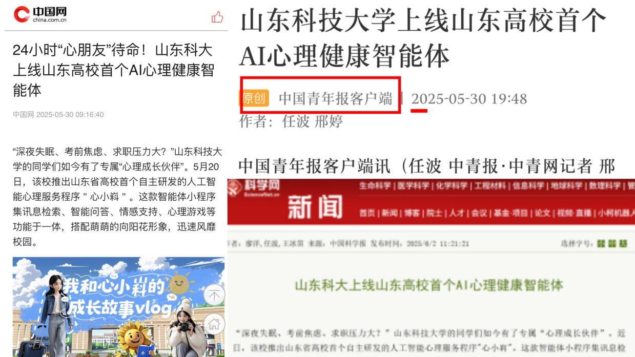 中国青年报客户端、中国网、科学网等主流媒体报道学校AI赋能心理健康工作
